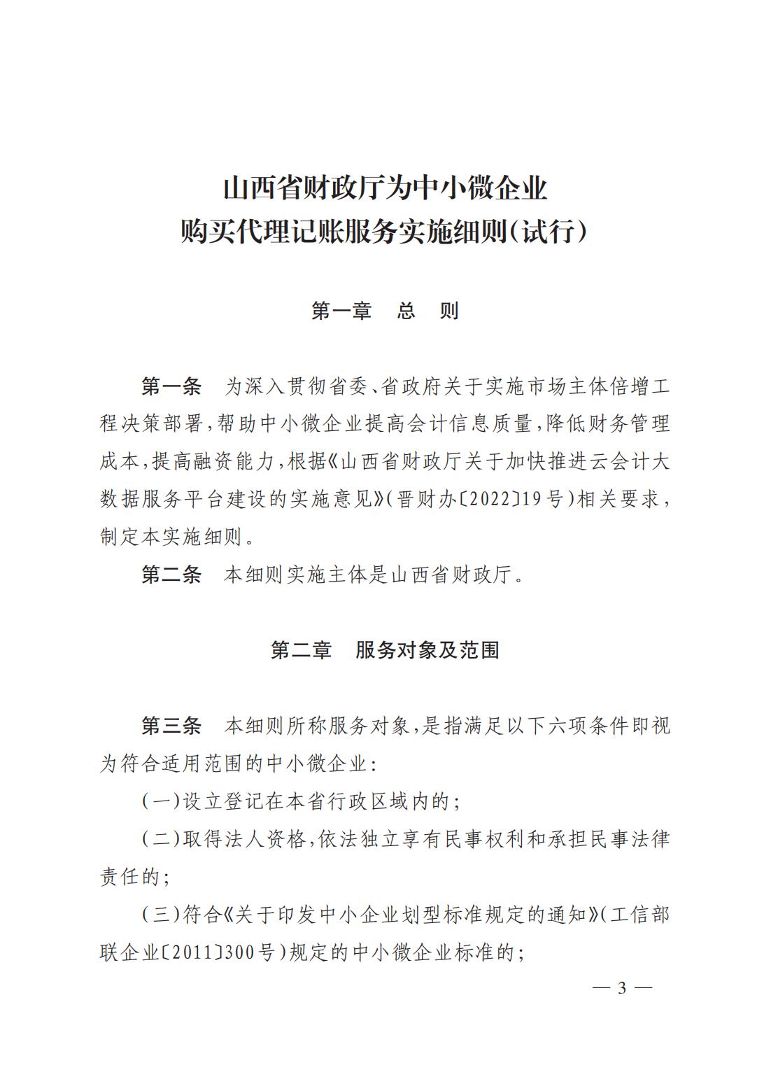 山西省財(cái)政廳為中小微企業(yè)購(gòu)買代理記賬服務(wù)實(shí)施細(xì)則(試行)